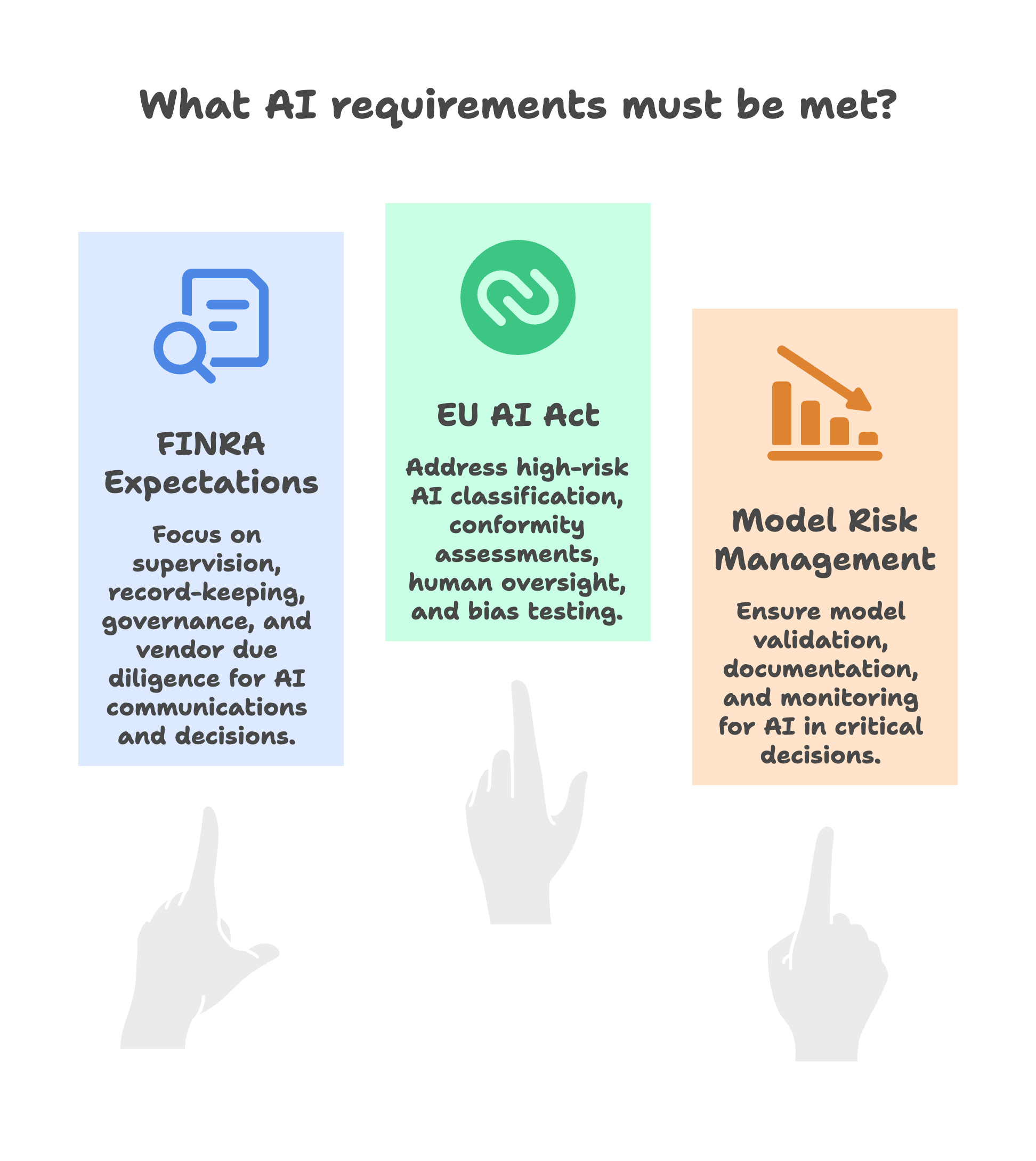 Model validation applies to AI: OCC, Federal Reserve, and FDIC model risk management expectations apply to AI and ML. Validate models and document controls just like traditional models.