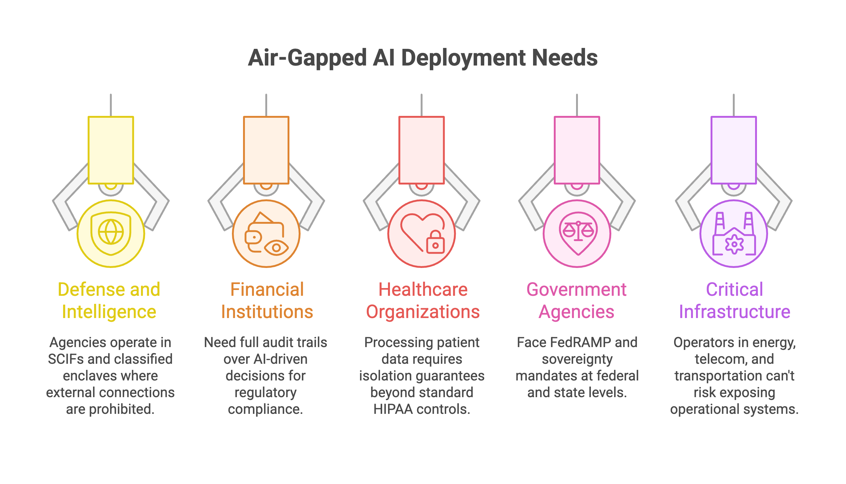Defense and intelligence agencies operate in SCIFs and classified enclaves where a single external connection disqualifies a tool from use. Financial institutions need full audit trails over AI-driven decisions for regulatory compliance. Healthcare organizations processing patient data need isolation guarantees that go beyond standard HIPAA controls. Government agencies at federal and state levels face FedRAMP and sovereignty mandates. Critical infrastructure operators in energy, telecom, and transportation can't risk exposing operational systems.