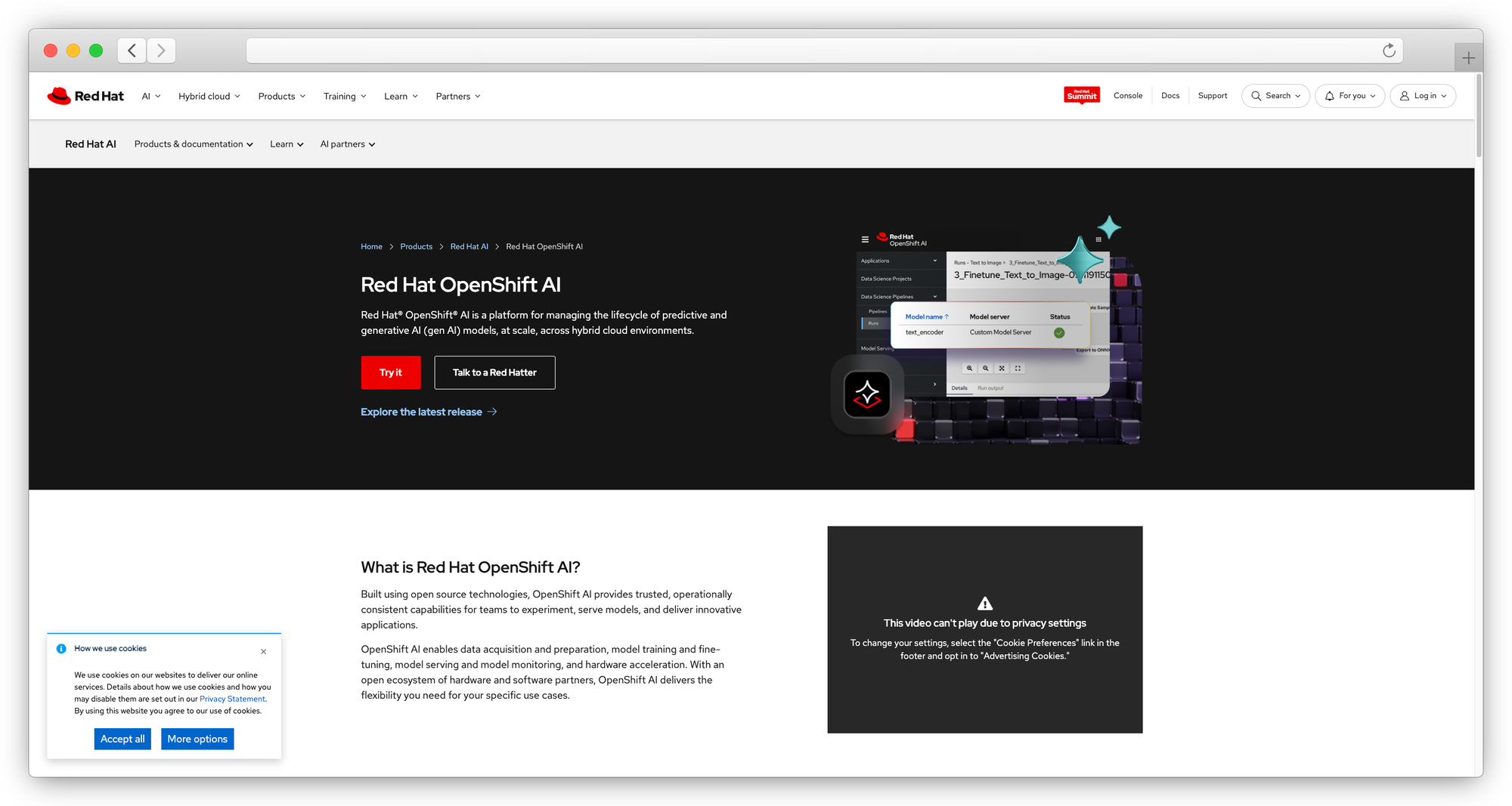 A Kubernetes-native MLOps platform that extends OpenShift into AI workloads. Air-gapped installation uses the oc-mirror plugin and agent-based installer to deploy without internet access. GPU acceleration supports NVIDIA, AMD, and Intel hardware. The platform integrates with IBM watsonx.ai and partner tools like Anaconda, Intel OpenVINO, and NVIDIA AI Enterprise. Built on the upstream Open Data Hub project with 20+ open-source AI/ML components.
