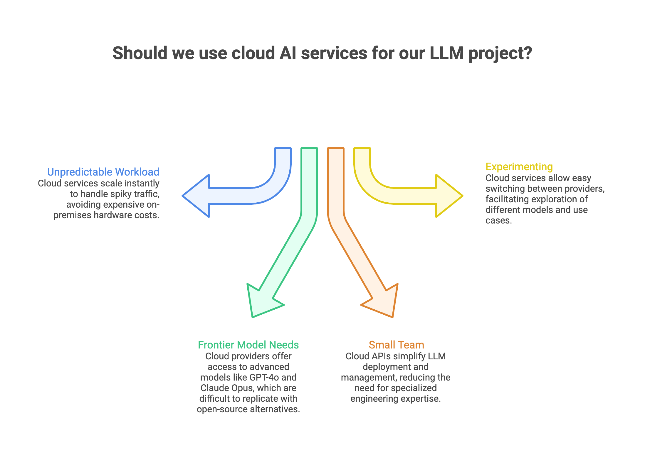 - You're still experimenting. Early-stage projects change direction constantly. New use cases, different models, shifting requirements. APIs let you swap between providers with a config change, not an infrastructure migration.