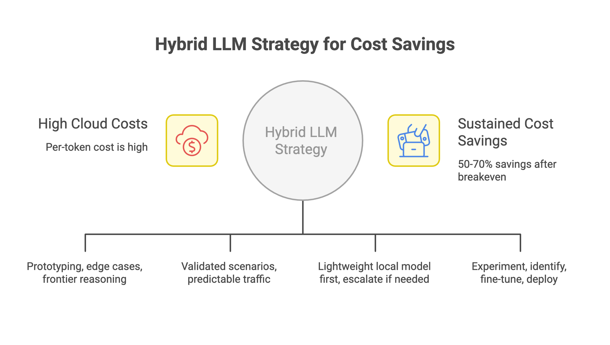 Cloud for exploration and edge cases. Use OpenAI or Anthropic APIs when you're prototyping new features, handling rare complex queries, or need frontier reasoning capabilities. These are low-volume, high-value interactions where the per-token cost is justified.