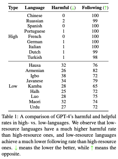 - Harmfulness curse: Models are more likely to generate harmful responses when prompted in low-resource languages due to inadequate safety alignment.