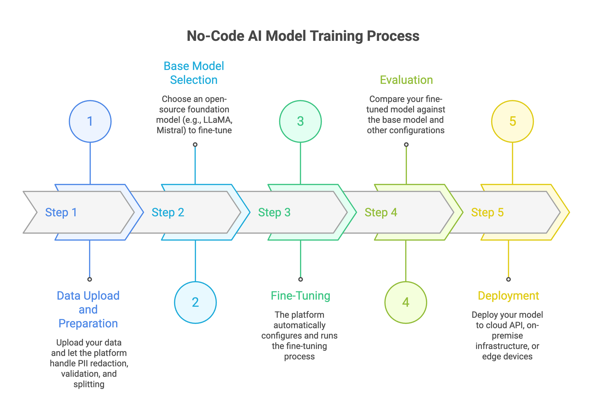 You pick a foundation model to fine-tune. Options typically include open-source models like LLaMA, Mistral, Qwen, and Gemma in various sizes. Smaller models (7B-13B parameters) train faster and cost less. Larger models handle more complex tasks.