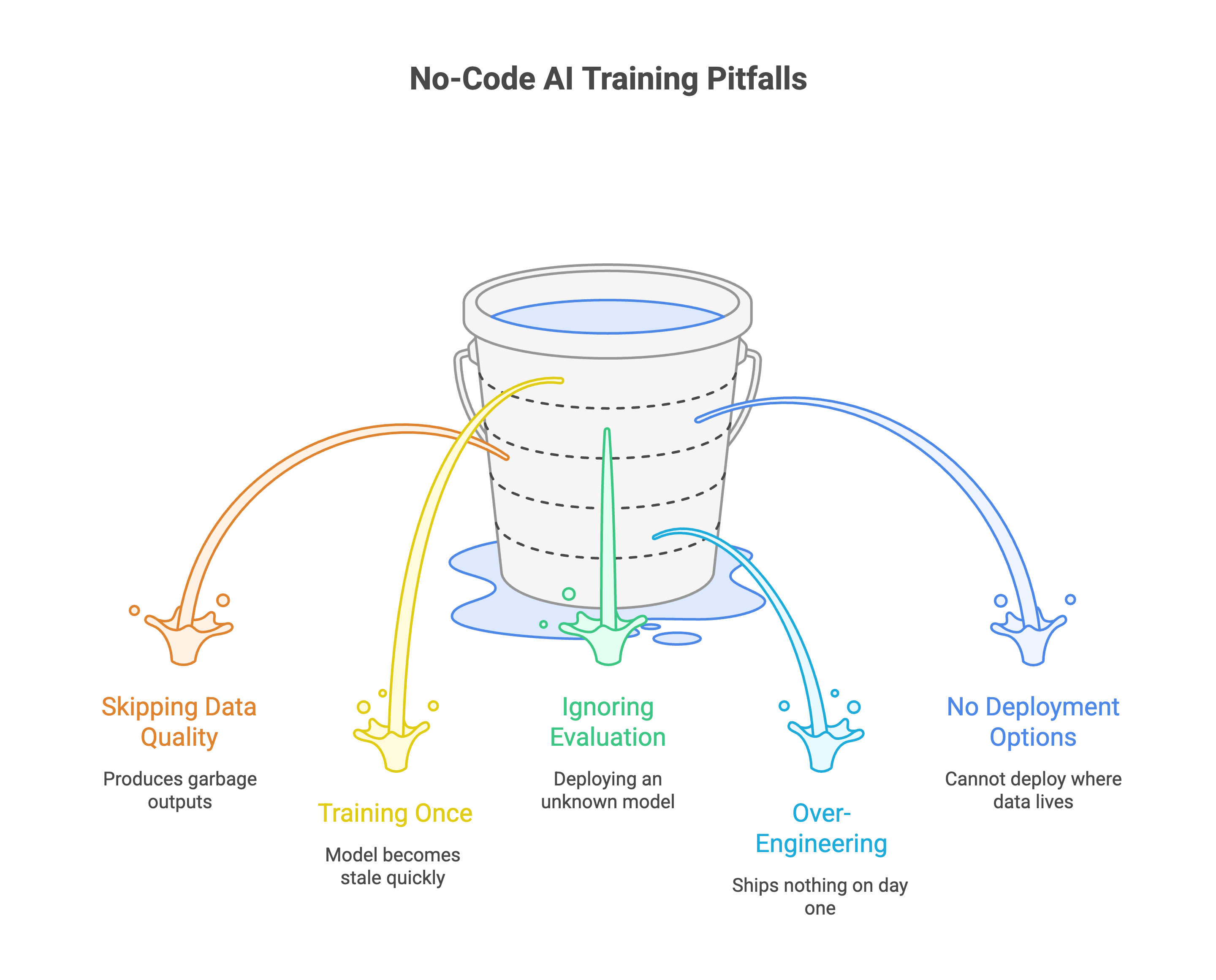 1. Skipping data quality. The most common failure. Teams upload raw data without cleaning, deduplication, or validation. The model trains fine but produces garbage outputs. Spend time on your dataset. It matters more than which model you pick.