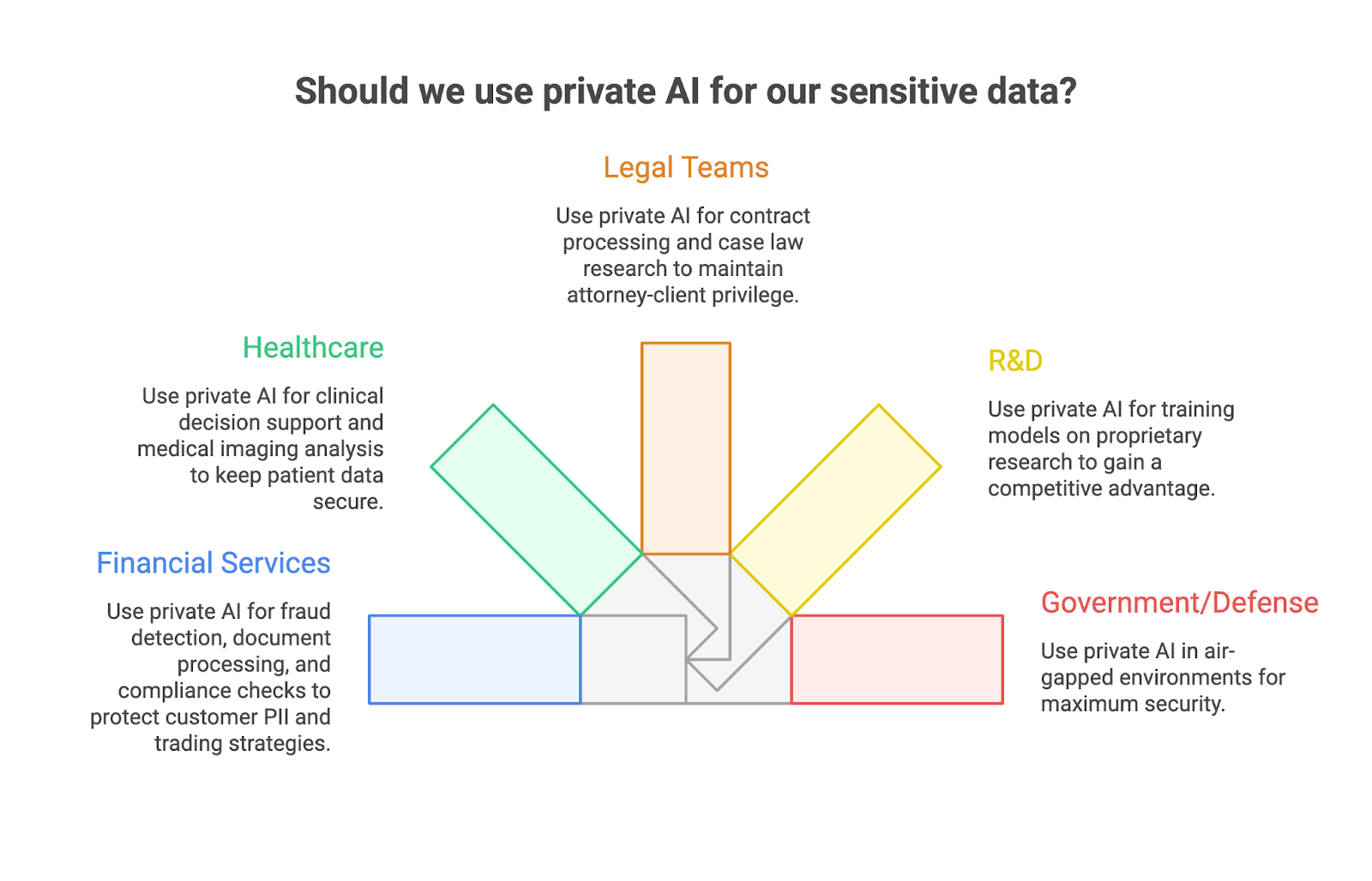 Financial services, healthcare, government, and defense often have strict rules about where data can physically reside. Public AI providers can't always guarantee jurisdiction. Private deployment can.